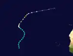 On October 17, a stationary front positioned over the eastern Atlantic began to dissipate, and a large area of low pressure began to form along the front boundary.[2] The disturbance intensified to tropical storm strength at 0000 UTC on October 18 about 1,220 mi (1,965 km) northwest of the westernmost islands of Cabo Verde,[3] after losing baroclinity.[2] As it moved towards the north, the system slowly intensified to an estimated peak intensity of 70 mph (110 km/h) at 0600 UTC on October 19,[3] as suggested by a nearby ship that also reported 70 mph (110 km/h) winds.[2] At the same time, the storm also turned eastward, and subsequently began to weaken. The system degenerated to tropical depression strength on October 21, and dissipated shortly thereafter around 415 mi (670 km) southwest of the central Azores.[3]