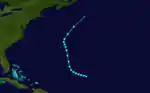 A tropical depression was first identified on October 8 about 575 mi (925 km) northeast of the Virgin Islands and quickly intensified to a tropical storm. Moving towards the west and then northwest, the storm intensified to its peak intensity of 60 mph (97 km/h) at 1800 UTC on October 10 as it neared Bermuda.[3] The island reported sustained wind speeds up to 40 mph (64 km/h).[2] The storm weakened as it progressed farther northward and curved toward the northeast, before transitioning into an extratropical cyclone by 0600 UTC on October 12 approximately 205 mi (330 km) southeast of Sable Island.[3] The system was absorbed by a strong cold frontal boundary later that day.[2]