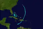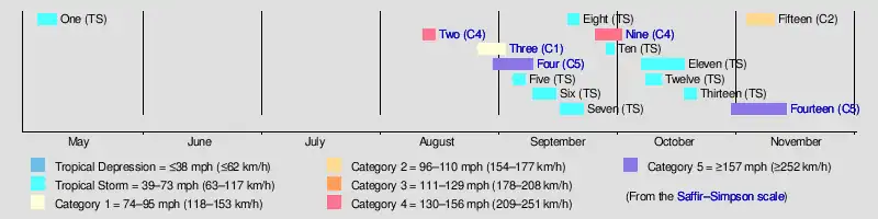 | Fourteen | October 30 – November 13 | Category 5 hurricane | 175 (280) | ≤915 | Leeward Islands, Venezuela, Colombia, Jamaica, Cayman Islands, Cuba, the Bahamas, Bermuda | $44 million | >3,144 | [41][42][43][47] | ||
