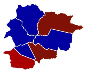 The interpretation of the results is complicated because there were no formal political parties, instead councilors were linked to groups that could vary in opinion.[5] The day after the elections, the press reported 14 seats had been won by the Integral Nationalist Group (GNI), conservative supporters of the co-princes; five seats had been won by the Andorran Union (UA), supporters of the deposed General Council, and four had been won by socialists.[6] However, an undated document from the Permanent Delegation French also registered a majority of "anti-episcopal" councilors unfavorable to the co-princes.[7]