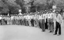 With the strength of about 75 horsemen and 100 men on foot, the Revolutionary Mexicanist Action marched through the esplanade. The group was organized militarily, marching in formation led by Rodriguez Carrasco. All members were dressed in gold shirts and wore sombreros, carrying with them flags and banners.[3] The group handed out pamphlets with pre-requisites to those interested in joining the organization.[1][2]