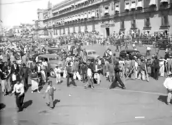 The 1935 Revolution Day Zócalo Battle was a violent conflict that broke out during the Revolution Day festival of 1935 at the Zócalo between members of the Revolutionary Mexicanist Action (Spanish: Acción Revolucionaria Mexicanista) and multiple organizations associated with the Mexican Communist Party. Members of the Revolutionary Mexicanist Action parading through the square were met individuals associated with the Mexican Communist Party with the latter antagonizing the former. The brawl lasted about an hour and resulted in 46 to 50 injuries and 3 casualties.[1][2][3][4] Among the wounded was Nicolás Rodríguez Carrasco, leader of the Revolutionary Mexicanist Action.[3][5]