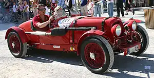 The Alfa Romeo 8C had been the premier car to beat in the 1930s races, yet this year there was only a single entry. Ferrari had provisionally entered three cars, but when Alfa Romeo bought out an 80% share of the Scuderia early in the year, their Chairman Ugo Gobbato chose to withdraw their cars. So the only Alfa presence was entered by Raymond Sommer. The Alfa Romeo 8C-2900 had been specifically designed for the Mille Miglia, the premier Italian sports-car race. The shorter wheelbase and supercharged 3-litre engine was well-suited to the long straights and tight town-corners. Scuderia Ferrari won in 1936 and 1937, along with the Spa 24 Hours. The twin-supercharged 8-cylinder engine put out 220 bhp.[10] A brand new car, painted black, was built at Portello for Sommer and driven straight to Le Mans by his prospective co-driver Giovanni Battista Guidotti. They would be supported by Meo Costantini as pit manager, sporting director at Alfa Romeo and former Bugatti team manager.[10]