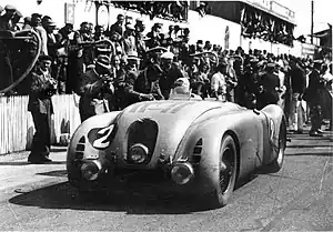 Automobiles Bugatti had struggled in Grand Prix racing, with their Type 59 proving unsuccessful. Under the new ACF regulations work had started on the new car soon after the 1936 race was cancelled. The Type 57 Grand Prix (later shortened to 57G) was developed from the Type 57S luxury tourer. The 3266cc racing engine put out 170 bhp with the main chassis members drilled out with holes to reduce weight. On the long back straight, it could reach almost 220 kp/h (135 mph). With a 130-litre fuel tank, over it all was a full-width streamlined magnesium-alloy body encompassing the wheels, and giving it the nickname "tank". It was also fitted with hydraulic brakes and a 4-speed synchromesh gearbox.[3][4] In the hands of Grand Prix driver Jean-Pierre Wimille and Raymond Sommer, it had proven successful in 1936, including winning the French Grand Prix.[5] Meanwhile, Technical Director Jean Bugatti was also working on a 4.5-litre version and originally two of these Type 57S45 cars had been entered. However, time ran out to have them ready and so Bugatti stalwart Roger Labric entered two of the three Type 57Gs on behalf of Bugatti. For Wimille, it was his first Le Mans, and was joined by Robert Benoist, former works driver and current Competition Director, while voiturette driver Pierre Veyron raced with Labric himself, in the second car.[3][6]