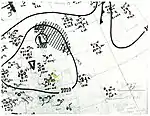 The final cyclone of the 1938 season developed by 06:00 UTC on November 7 off the northern coast of Haiti.[6] In its early stages, the system exhibited a broad radius of maximum winds and was in close proximity to a stationary front, suggesting it was a subtropical storm for most of its duration. High pressure to the north directed the cyclone northwest, and it made landfall on Inagua in the Bahamas with winds of 70 mph (110 km/h) at 11:00 UTC on November 7; these winds were located well north of the center. It made a second landfall eight hours later on Crooked Island at an unchanged strength. The storm began to weaken early on November 8 and curved southwestward later that day, bringing it ashore the central coastline of Cuba with winds of 50 mph (80 km/h) around 06:00 UTC on November 9.[5] The system continued into the northwestern Caribbean Sea, where it merged with a former frontal boundary and dissipated after 18:00 UTC on November 10.[5][6]