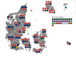 | Communist Party of Denmark | 40,893 | 2.41 | 3 | +1 | |