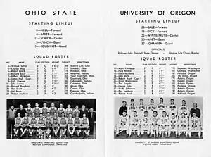 Oregon scored the first points of the game, as Anet rebounded a missed Webfoots field goal attempt and made his subsequent shot. Anet and Dick each made one free throw, before a shot by Johansen gave Oregon an early 6–0 advantage.[25] The Webfoots played at a fast pace from the outset, a style of play that the Buckeyes were unaccustomed to. However, the Buckeyes managed to rally. Hull scored the team's first point on a free throw at approximately the 3:30 mark, and they scored the next two baskets.[25][26] A pair of baskets by Lynch brought them to within one point of the Webfoots, 12–11, before two Johansen baskets and an Anet score brought Oregon's lead up to seven.[26] Ohio State's defensive efforts were primarily aimed at stopping Wintermute and Gale; instead of featuring those players exclusively, the Webfoots spread offensive opportunities throughout their starting lineup, and Gale later called himself "a decoy" in the game.[6] Hull responded to Oregon's run by making a hook shot, and after Dick made a field goal attempt Ohio State scored the last two baskets of the first half. The Webfoots held a 21–16 lead at halftime.[26]