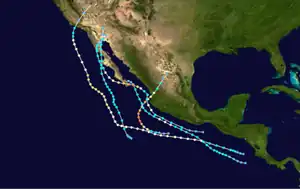 On September 14, a tropical cyclone formed off the coast of Central America. This tropical storm tracked northwestward and intensified into a hurricane.[6] The sea-level pressure dropped to 975 mbar (28.8 inHg) or lower. The hurricane recurved gradually to the northeast and weakened over cool seas. On September 25, this tropical storm made landfall near Long Beach, California, and dissipated inland.[8]
