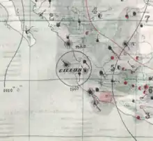 On October 23, a tropical cyclone formed south of Cabo Corrientes, Jalisco. It intensified and headed roughly due north. A steamer, the Nevadan, caught in the eye of this extremely intense hurricane, recording a corrected central pressure of 930 mbar (hPa; 27.46 inHg).[9] Even with modern tropical cyclone observation techniques available, this reading still qualifies this cyclone as one of the most intense on record and would likely have made it a Category 4 or 5 hurricane.[10] The steep pressure gradient between the Nevadan and the external hurricane conditions off of Manzanillo, Colima caused several tarpaulins to burst.[9] Other shipping was disrupted off the Mexican coast by the intense tropical cyclone.[11]