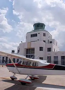 The museum is housed in the Houston Municipal Airport Terminal building, a streamline moderne airport terminal built with Public Works Administration (PWA) funds in 1940.[3] The terminal building is among the few surviving examples of classic art deco airport architecture from the 1940s. The terminal served Houston during the years when air travelers dressed in their best and embarked for destinations aboard roaring prop liners like the Douglas DC-3 and the Lockheed Constellation.[4] Designed by architect Joseph Finger (who also designed Houston's City Hall), the terminal was designed to meet Houston's growing role as a center for air commerce in the late 1930s.[5] The terminal served as the only commercial air terminal for Houston until 1954, and was subsequently used by various tenants until 1978. In that year, Hobby Airport's manager James Delong proposed demolishing the 1940 terminal to free up ramp space, but enthusiasts blocked the demolition.[6] The terminal was then unoccupied for nearly 20 years.