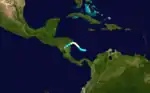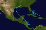 A westward moving tropical depression developed in the southwestern Caribbean Sea just west of Bluefields, Nicaragua at 1200 UTC on September 18.[2][3] The following day, the depression intensified into a tropical storm at 0600 UTC.[3] The tropical storm made landfall on the Mosquito Coast of Nicaragua at 1400 UTC, with winds of 40 mph (64 km/h).[3][6] The cyclone weakened to a tropical depression over land, but reintensified back to tropical storm strength upon entry into the Gulf of Honduras on September 20.[3] The cyclone's northwest motion caused it to make a second landfall near the border of Mexico and British Honduras at 0300 UTC on September 21 as a slightly stronger system with winds of 50 mph (80 km/h);[nb 4][6] this would be the storm's peak intensity. Over the Yucatán Peninsula, the tropical storm re-weakened, but later intensified once again once it reached the Gulf of Mexico. In the Gulf, the storm made a gradual curve northward,[3] before making a final landfall near Lafayette, Louisiana at 0900 UTC on September 24 with winds of 45 mph (72 km/h) and a minimum barometric pressure of 1,002 mbar (1,002 hPa; 29.6 inHg).[2][6] Once inland, the tropical cyclone curved eastward and weakened before dissipating the next day, after becoming absorbed by a frontal boundary.[6]