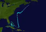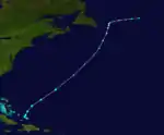 A tropical depression was first detected east of the Lesser Antilles on September 7,[3] though at the time weather observations in the area were sparse.[2][6] The disturbance gradually intensified throughout much of its early formative stages, attaining tropical storm strength on September 10; further strengthening into a hurricane north of Puerto Rico occurred two days later. Shortly thereafter, the hurricane recurved northward, and reached peak intensity the following day as a modern-day Category 2 hurricane with maximum sustained winds of 100 mph (160 km/h) and a minimum barometric pressure of at least 988 mbar (988 hPa; 29.2 inHg).[2][6] The cyclone steadily weakened thereafter before making landfall on Nova Scotia on September 17 with winds of 85 mph (137 km/h).[20] Moving into the Gulf of Saint Lawrence later that day, the storm transitioned into an extratropical cyclone. The remnant system curved eastward and passed over Newfoundland before dissipating over the Atlantic on September 19.[3]