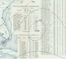 On November 2, a trough of low-pressure was analyzed near the Lesser Antilles. The system moved westward into the Caribbean Sea without much organization. On November 7, the low-pressure area moved south of Cuba and became sufficiently organized to be considered a tropical depression with a pressure of at least 1,010 mbar (1,010 hPa; 30 inHg). The depression moved over Cuba and into the Atlantic, where it dissipated the following day. On November 9, a second system was detected northeast of Bermuda with a pressure of 1,005 mbar (1,005 hPa; 29.7 inHg), though it remained unclear whether the two systems were related.[6]