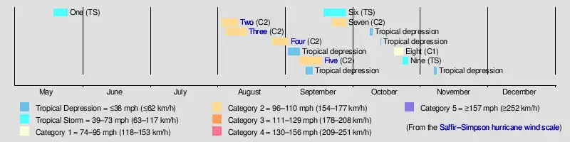 | 9 systems | May 19 – October 26 | 110 (175) | 961 | $29.3 million | 71 | |||||