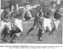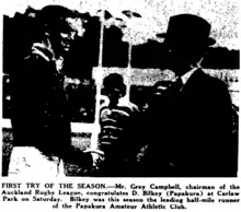 Roy Mansill debuted for Mount Albert. He was the Auckland amateur sprint champion and the son of Arthur Mansill who played a generation earlier for Newton Rangers. Roy enlisted in the NZ air force as a pilot and was killed on a training flight at RNZAF Base Ohakea in 1945.[23][24] In the match between Richmond and Marist, Frank Furnell broke his left arm and was taken by ambulance to Auckland Hospital. His arm was set and he was later discharged.[25] Desmond Bilkey of the Papakura side scored the first try of the season and after the match was congratulated by chairman Campbell. Bilkey had recently become the leading half mile runner at the Papakura Athletic Club which was also based at Prince Edward Park in Papakura as was the rugby league club. He enlisted shortly after this photo was taken and went to war. He was wounded in 1945 before returning to New Zealand.