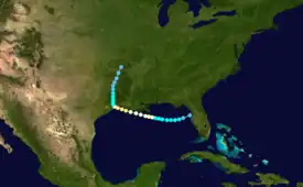 At 1800 UTC on August 5, the storm strengthened to hurricane strength, the first tropical cyclone of the season to do so. At the time, the hurricane was moving very slowly westward, allowing it to strengthen despite its close proximity to land. The hurricane reached Category 2 intensity by 0600 UTC on August 7.[3] The storm made landfall at peak intensity at around 2100 UTC later that day near Sabine Pass, Texas. At the time, the hurricane had maximum sustained winds of 100 mph (160 km/h), with the storm's maximum winds extending out 10 mi (15 km) from its center.[2] A weather station in Sabine Pass recorded a barometric pressure of 972 mbar (hPa; 28.71 inHg), which was analyzed to have been the lowest pressure measured in association with the storm.[2][3] After moving inland, the storm immediately curved northward and began to gradually weaken.[1] At 0600 UTC on August 8, the cyclone weakened to tropical storm strength while situated over East Texas, and later degenerated to a tropical depression by 1200 UTC the following day. The depression persisted into Arkansas,[4] where it transitioned into a trough of low pressure at 1800 UTC on August 10 after its center of circulation lacked the well-defined closed circulation characteristic of tropical cyclones.[2]