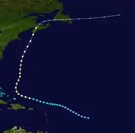At 1800 UTC on September 12, the storm intensified into the equivalent of a modern-day Category 1 hurricane to the north of Puerto Rico.[1] The following day, the hurricane began to recurve northward, attaining Category 2 intensity at 1200 UTC.[2][1] Numerous vessels in its vicinity reported hurricane-force winds; the S.S. Borinquen observed a minimum peripheral pressure of 988 mbar (hPa; 29.18 inHg), the lowest observed pressure associated with the hurricane.[2][3] At the time, the storm had maximum sustained winds of 100 mph (160 km/h), which it maintained throughout its duration as a Category 2 system. Progressing rapidly into more northerly latitudes, the storm weakened to a Category 1 hurricane by 1800 UTC on September 15.[1] By the next day, two warm fronts began extending eastward from the cyclone as the wind field expanded in size, indicating the start of an extratropical transition. At 0200 UTC, the hurricane made landfall near Lockeport, Nova Scotia, with winds of 85 mph (135 km/h).[3][1][4] The storm fully transitioned into an extratropical cyclone over the Gulf of Saint Lawrence by 1200 UTC on September 17.[1] In the gulf, the system turned eastward, causing it to move ashore Newfoundland just north of Cape Race during the evening of September 18.[2] After passing over the island, the extratropical storm reentered the Atlantic Ocean, where it gradually weakened before dissipating on September 19.[1]