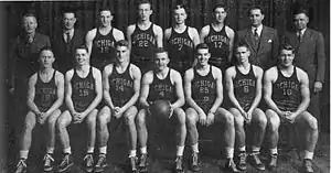 The 1943–44 team also included three athletes, Don Lund, Bob Wiese and Elroy "Crazy Legs" Hirsch, who went on to play professionally in sports other than basketball. Lund played football, baseball, and basketball at Michigan, received a total of nine varsity letters, and later played Major League Baseball from 1945 to 1954.[9][10] Wiese played for the Detroit Lions from 1947 to 1948.[11] Hirsch was the first University of Michigan athlete to receive varsity letters in four sports in the same academic year. Hirsch lettered in football, basketball, track and field (as a broad jumper), and baseball during the 1943–44 academic year.[12] Hirsh went on to play 12 seasons in the All-America Football Conference and the National Football League.[13] Five participant on the 1943–44 Michigan basketball team were inducted into the University of Michigan Athletic Hall of Honor. Head coach Bennie Oosterbaan, who was a multi-sport star at Michigan in the 1920s and head football coach from 1948 to 1958, was one of the inaugural inductees in 1978. Elroy Hirsch, Don Lund, Dave Strack was inducted in 1984.[14][15] Bruce Hilkene, who was the captain of the undefeated 1947 Michigan Wolverines football team, was inducted in 1992.