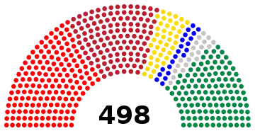 The Hungarian Communist Party won 89 of the 230 seats, increasing to 166 of the 498 seats after the 1945 elections.[1] The Assembly first convened in Debrecen on 21 and 22 December 1944, establishing a new government and declaring war on Nazi Germany.[1] Its second session was held in Budapest in September 1945, establishing fresh elections and passing legislation on land redistribution.[1]