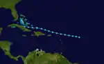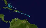 Around 00:00 UTC on August 2, the third tropical cyclone of the season formed about 85 mi (137 km) northeast of Barbados. It crossed Dominica into the Caribbean Sea, where the storm attained peak winds of 60 mph (97 km/h) and prompted small craft advisories.[2][12] Missing Puerto Rico to the south, the cyclone then moved ashore west of Santo Domingo in the Dominican Republic at peak strength early on August 4.[3] It dissipated over the island later that day and produced only scattered thundershowers across the region.[2][13]