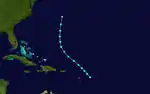 Another short-lived tropical storm was first identified about 195 mi (314 km) east of Guadeloupe by 12:00 UTC on September 9. Data from a reconnaissance aircraft indicated the storm intensified slightly to attain winds of 60 mph (97 km/h) by early the next day,[2] in spite of a poorly-defined circulation center.[3] It tracked northwest and then north, passing within 130 mi (210 km) of Bermuda before dissipating around 18:00 UTC on September 12.[2]