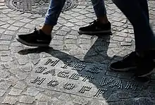 Between June 2015 and March 2016, 15,509 virtual stones were placed on the website plaatseensteen.nl / placeastone.nl, shaping the letters of the victims’ names. On 1 March 2016, the end result was transferred to stone reliefs and embedded in the pavement of Dam square. The memorial was unveiled by Mayor Eberhard van der Laan on 7 May 2016 following a ceremony in the Nieuwe Kerk church.[7][8]