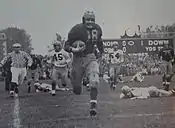 In the fifth week of the season, Michigan played its homecoming game against Minnesota. Michigan won a close game by a score of 13-6. Michigan scored first on a long touchdown pass from Bob Chappuis to Bump Elliott. The final touchdown in the fourth quarter followed a 24-yard interception return by Jack Weisenburger to the Minnesota 21-yard line. Gene Derricotte scored after faking to the right and then running through a hole on the left side and into the endzone. Chappuis was held to 26 rushing yards, less than two yards per carry.[13] While Michigan won a close game over Minnesota, No. 2 Notre Dame defeated Iowa in South Bend, 21-0. In the AP Poll released after these games, Notre Dame passed Michigan to take the No. 1 ranking.