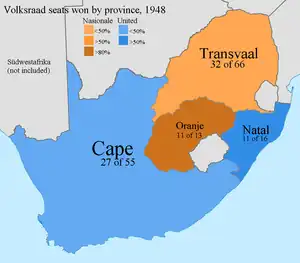 Demarcation of electoral district boundaries favoured the HNP.[4] Most of the 70 seats won by the National Party during the 1948 election were in rural areas, whereas most of the 65 seats won by the United Party were in the urban areas. According to the Constitution that South Africa had at the time, the constituencies in the rural areas were smaller than those in urban areas. This meant that there were more rural constituencies than urban ones. This was to the benefit of the National Party since it tended to do well in rural areas in terms of votes. Despite winning 140,000 fewer votes than the UP, the NP/AP coalition gained a plurality of seats in Parliament, and was able to enter into a coalition with the Afrikaner Party to form a majority government. It has been calculated that if rural and urban votes had been of equal value, the UP would have won 80 seats, the HNP/AP 60 seats, and other parties the remaining seats, thus giving the UP a majority outright and perhaps delaying or preventing apartheid from taking place.[5]