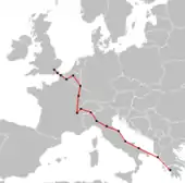 The ship dropped the torch off in Bari at 12:30 pm on 19 July.[8] It was run north through several Italian cities before crossing the Simplon Pass into Brig, Switzerland on 23 July. From there it was run west until leaving the country at Perly-Certoux, and entering France at Saint-Julien-en-Genevois. The route then detours from the direct route to take in Luxembourg and into Belgium before re-entering France at Lille on 28 July, finally departing the country at Calais. HMS Bicester carried the torch across the English Channel to Dover, arriving at 8:25 pm on 28 July. It travelled through several towns in the South East of England until it arrived at Wembley,[5] where it arrived only thirty seconds late after the entire journey. That delay may have only been in the final few hundred yards of the relay down Olympic Way outside of Empire Stadium as the pressure of the crowds on the torch carrier and their escorts reduced the pace to walking speed. Special celebrations were held at each border crossing, and at Pierre de Coubertin's tomb in Lausanne, Switzerland.[3][8]