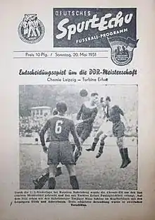 The championship play-off of the 1950–51 DDR-Oberliga took place on 20 May 1951 at the Ernst-Thälmann-Stadion in Chemnitz between Chemie Leipzig and Turbine Erfurt. The match decided the winner of the 1950–51 DDR-Oberliga, the 2nd season of the DDR-Oberliga, the top-level football league in East Germany. The match was necessary as both teams finished the season level on points. At the time, the rules stated that if this were to occur, a playoff would be necessary to decide the national champion. With a 2–0 victory, Chemie Leipzig secured the championship for their 1st national title.[1]