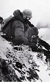Desio stated that Camp VIII was established just below 7,700 metres (25,400 ft).[11][note 4] After going down to collect equipment and "two oxygen masks" [sic] from halfway down towards Camp VII (the height of which was not stated),[13][note 5] Bonatti and Mahdi got back up to Camp VIII by noon on 30 July and then continued with Abram carrying the oxygen respirators towards Camp IX which was had just been established at 8,100 metres (26,575 ft) and where they were to spend the night.[15] CAI 2007 reported that, whereas Desio had said the plan had been for Camp IX at 8,000–8,100 metres (26,200–26,600 ft), on 30 July this was reduced to 7,900 metres (25,900 ft) to allow the oxygen sets to be carried there in one day. The report quoted Lacedelli as eventually saying Camp IX was actually at about 8,150 metres (26,740 ft) and Bonatti and Mahdi's bivouac was at 8,100 m.[12] Desio's book described how, as night fell,[note 6] Bonatti realised he would not reach Camp IX so he called up to the assault team who told them to go down quickly to Camp VIII. However, Mahdi was unfit even to descend so they dug a snow hole for an overnight bivouac without a tent or sleeping bags.[19][note 7] Mahdi had become severely frostbitten by the time they set off down together at dawn.[21][note 8]
