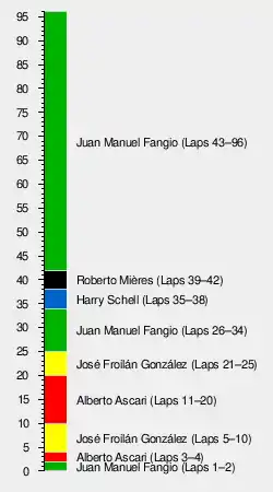 According to former Ferrari and Maserati chief mechanic Giulio Borsari, Fangio acclimatized himself by moving to Argentina one month prior to the race and reducing his water consumption to one liter a day to cope with the extreme heat.[2] Fangio also suffered severe burns to his leg which, for the entire duration of the race, was rubbing against the chassis frame which was being heated by the exhaust. It took him 3 months to recover; his next race in Monaco was not until late May. It left a permanent scar on his leg later in life.