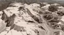 On 23 April Camp I was established in a small dip on a rocky spur at 5,300 metres (17,390 ft) and Camp II, established 29 April, was above a rocky hummock at the entry to the northwest cirque.[59] Acclimatisation training continued during this time and Franco identified Terray and Couzy as likely lead candidates for the summit but he felt happy to have a very strong team around him. The weather was good – sunny and calm in the mornings but windy and cloudy with snow showers in the afternoons. Only once was there a violent storm. They had arranged for radio broadcasts of weather forecasts from Radio Calcutta but nothing materialised until one day they received a forecast along with ones for the Germans concurrently on Dhaulagiri, where the forecast was for severe storms, and for the British Kangchenjunga expedition. Franco's party could see poor weather around them on Everest, Lhotse and Chamlang which encouraged them to hasten their preparations.[60] Latreille and Vialatte took the opportunity of climbing Pethangtse prior to Latreille and Bourdet embarking on further geologising around Sola Khumbu and Namche Bazaar.[61] Supplies were continually being carried by the Sherpas as high as Camp III which was stocked to become Advanced Base Camp. There the tents were set in 0.91 metres (3 ft) deep platforms dug into the glacier and by 10 May the camp held sufficient supplies and equipment for a summit attempt.[62] Cooking could not be done on paraffin stoves at such an altitude and so gas cylinders needed to be used.[63]