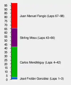 - Car #30: Juan Manuel Fangio (22 laps) and Luigi Musso (0 laps).