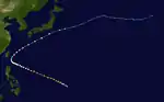 About two weeks after Tropical Storm 01W dissipated over the Philippines, a new tropical depression formed to the southeast of Guam on January 21. Gradual intensification took place as the depression tracked westward.[3] The JTWC began monitoring the system as Tropical Storm Rose the following day,[1] with the first advisory on the storm placing maximum winds at 50 mph (80 km/h). Rose maintained this intensity for roughly 24 hours before undergoing a brief period of rapid intensification, attaining winds of 110 mph (180 km/h) early on January 23. For most of the day, the now Category 2 typhoon, strengthened at a more modest rate before undergoing a second brief period of rapid intensification. At the end of the second strengthening phase, Rose had attained its peak intensity just below Category 5 status, on the modern-day Saffir–Simpson Hurricane Scale, with winds of 155 mph (249 km/h),[4] and a minimum pressure of 952 millibars (28.1 inHg).[3] Upon attaining this intensity, Rose became the most intense January typhoon on record, surpassing that of Super Typhoon Karen in 1948.[4][5]