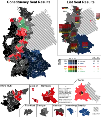 ![]() The left side shows the winning party vote in the constituencies, the right side shows the seats won by parties in each of the states. The pie chart over West Berlin shows the partisan composition of its legislature. | |||||||||||||||||||||||||||||||||||||||||||||||||||||||||||