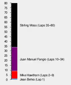 Jean Behra in a privateer Maserati 250F led at the start but was quickly passed by Hawthorn. By lap ten Juan Manuel Fangio had taken the lead in the Scuderia Sud Americana entered Maserati 250F and Moss had worked his way forward into second position as the pitstops began for the heavier Italian built cars.[3]