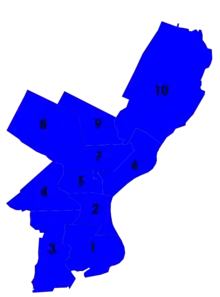 Philadelphians elected a seventeen-member city council in 1959, with ten members representing districts of the city, and the remaining seven being elected at-large. For the at-large seats, each political party could nominate five candidates, and voters could only vote for five, with the result being that the majority party could only take five of the seven seats, leaving two for the minority party. The Democrats' citywide dominance continued into the city council races, as took control of all ten of the district seats, up from nine in the previous election. They also retained five of seven at-large seats.[19]