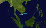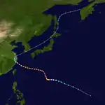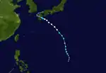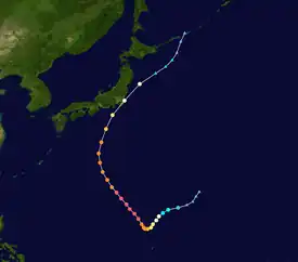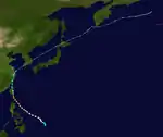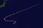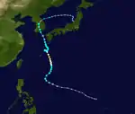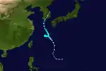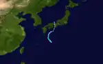On September 29, a tropical depression formed with 30-knot winds. The system tracked westwards, briefly intensifying into a tropical storm. The system made landfall on the Japanese island of Shikoku a tropical depression.[6]