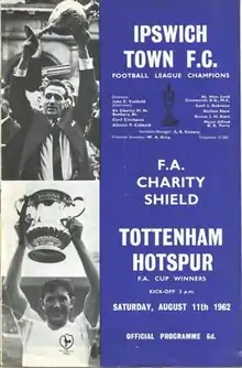 Ipswich had won the league in the previous season, three points clear of Burnley and losing just twice at home at Portman Road throughout the season.[4][5] Despite being promoted from the Second Division the previous season, they went on to win back-to-back league titles.[6] Ray Crawford was the previous season's league top scorer, with 33 goals in 41 matches.[7] Ipswich were managed by former Tottenham player Alf Ramsey,[7] and had defeated the London club twice in the league the previous season.[8] Tottenham Hotspur had beaten Burnley 3–1 at Wembley in the FA Cup final three months earlier.[9] The club finished third in the league, four points behind Ipswich.[4] Jimmy Greaves was Tottenham's top scorer the previous season, scoring 29 goals in 28 games.[7]