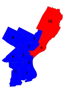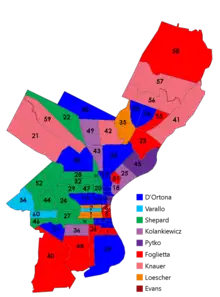 In the at-large seats during the general election, as in the mayor's race, the Democratic share of the vote decreased but they still reelected all five of their candidates.[20] Republicans reelected incumbents Thomas Foglietta and Virginia Knauer to their two at-large seats.[20] In the district races, there was more change. Republicans defeated incumbent Democrats in the two seats representing Northeast Philadelphia in races that The Philadelphia Inquirer reporter Joseph C. Goulden said turned on City Hall corruption and civil rights issues.[20] The Democrats gained one seat back in the northwestern part of the city when Isadore H. Bellis narrowly defeated incumbent Stanley B. Smullen in a recently reconfigured 8th district.[20] Democrats retained their hold on the remaining seven district seats, though with reduced majorities.[21]