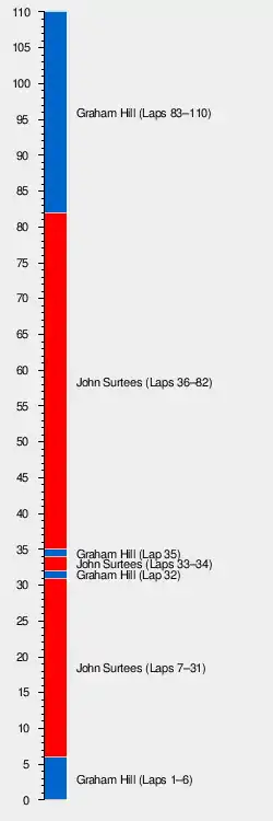 After trailing Surtees closely for some time, Hill lost his tow when his anti-roll bar came loose and the BRM's handling changed abruptly. Fighting severe understeer, he began throwing the car into turns to slide the rear end around, flinging stones off the curbs and losing ground to the leading Ferrari. On lap 82, with no threat to his lead, Surtees's engine lost power, and he cruised into the pits to retire. "I was just hanging on to him," Hill said afterward. "He's a very tricky driver. He was gaining a half-second each lap on me until he went out. I think it was a good measure of the difference in our two cars." Suddenly in the lead again, with only Ginther on the same lap, Hill backed off and set his sights on bringing the car home.