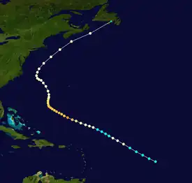By late on September 12, the storm curved northeastward and passed to the northeast of Bermuda early the next day,[3] bringing 4.05 in (103 mm) of precipitation and wind gusts up to 70 mph (110 km/h).[29][30] Throughout the island, low-lying areas were flooded and trees were felled. At St. George's Island, residents were briefly left without electricity and telephones and the causeway linking St. George's Island to the main island was inundated.[31] Early on September 13, Ethel intensified into a Category 2 hurricane and soon peaked with winds of 105 mph (169 km/h). The system became extratropical late on September 14, while located about 255 mi (410 km) southeast of Cape Race. Newfoundland. The extratropical remnants slowly weakened while meandering around the Atlantic, until dissipating just north of the Azores on September 17.[3]
