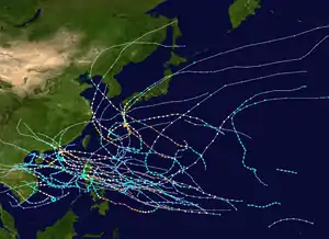 The 1964 typhoon season was the most active Pacific typhoon season on record.[1][2] All months between and including May and November were featured an above-average number of typhoons relative to the 1959–1976 period.[3] The China Meteorological Administration (CMA), Hong Kong Observatory (HKO), Japan Meteorological Agency (JMA), and Joint Typhoon Warning Center (JTWC) each maintain tropical cyclone databases that include their respective intensity and path analyses for 1964, resulting in disparate storm counts and intensities.[4] Total tropical cyclone counts for the 1964 season include 40 from the CMA, 34 from the JMA, and 52 from the JTWC (including 7 considered "suspect cyclones").[4][5][6]: 47 There were more named storms in the northwestern Pacific in 1964 than in any other year or in any other basin.[7]