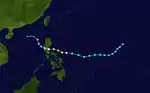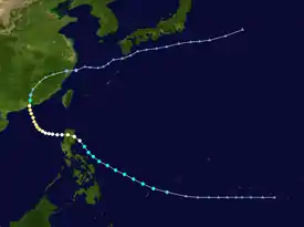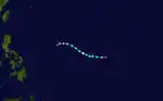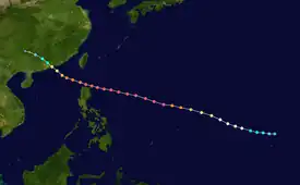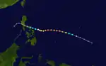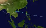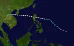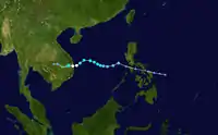 Typhoon Winnie—named Dading in the Philippines[45][15]—originated from a mid-Pacific trough, which organized into a cyclonic circulation on June 21 west-southwest of Pohnpei.[6]: 86 This initial system moved towards the west-northwest, passing near Ulithi on June 25. The next day, the disturbance developed into a tropical depression and gradually took on a more westward course. Winnie reached tropical storm strength on June 27 and then typhoon strength on June 28 as it rapidly intensified en route to southern Luzon.[44][12]: 74 The typhoon attained sustained winds of 165 km/h (103 mph) shortly before moving ashore Calabarzon on June 29;[44] its eye passed directly over Manila.[46] Winnie weakened as it moved over Luzon and restrengthened upon reaching the South China Sea, taking a west-northwesterly heading.[44][12]: 74 There, Winnie reached its peak intensity with winds of 185 km/h (115 mph) and a central pressure of 945 hPa (mbar; 27.91 inHg). At 00:00 UTC on July 2, the typhoon made landfall on Hainan southwest of Wenchang with winds of 175 km/h (109 mph). Winnie weakened to a tropical storm and traversed Hainan and the Gulf of Tonkin before making a final landfall near Haiphong, Vietnam, on July 3. Further weakening ensued as the system tracked across northern Vietnam and southwest China before dissipating on July 4.[44]