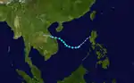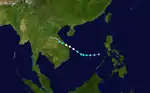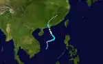 According to data from the Japan Meteorological Agency (JMA), the progenitor to Typhoon Viola emerged in the South China Sea just east of Vietnam on May 21.[34] This system initially moved towards the north before curving sharply east. Three days later, the system organized into a tropical depression after the JTWC identified a surface wind circulation.[6]: 81 Viola reached tropical storm strength on May 25 and then curved northwest, strengthening further into a typhoon on May 27 and peaking in strength with winds of 130 km/h (81 mph).[34] These winds diminished to 110 km/h (68 mph)—just under typhoon intensity—as Viola made landfall approximately 160 km (99 mi) west of Hong Kong at 03:00 UTC on May 28.[34][12]: 74 The storm weakened over mainland China and dissipated on May 30.[34]