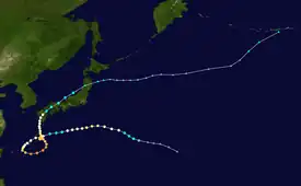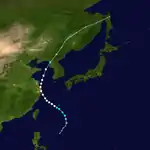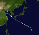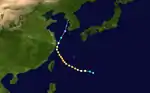 After passing the Ryukyu Islands and entering the East China Sea, Betty continued to intensify further, with its sustained winds reaching 205 km/h (127 mph) on July 5.[63] At the time, the typhoon was located approximately 320 km (200 mi) south of Shanghai.[12]: 75 Betty's winds subsequently began to diminish precipitously while the storm curved towards the north and then north-northeast, briefly paralleling the coast of Zhejiang before entering the Yellow Sea.[63][12]: 75 Betty degenerated into a tropical storm and further into a tropical depression on July 6. It then transitioned into an extratropical cyclone on July 7 and dissipated over open waters just off the coast of northwestern South Korea.[63][6]: 96