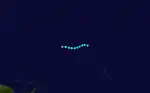 Tess tracked towards the northeast after reaching typhoon intensity. Its center passed between Alamagan and Guguan on May 20 while maximum sustained winds in the typhoon were 140 km/h (87 mph).[29] Farther southeast, in Guam, the passing storm produced 52 mm (2.0 in) of rain.[30] The next day, Tess reached its peak intensity with winds of 155 km/h (96 mph) and a minimum barometric pressure of 960 hPa (mbar; 28.35 inHg).[29] A seabee stationed on the island was presumed to have drowned after being swept away by the rough seas generated by the storm; two landing crafts were also destroyed by the rough seas.[31] At noon on May 21, the center of Tess passed 160 km (99 mi) west of Marcus Island,[12]: 74 bringing squalls accompanied by heavy rain and winds of 90 km/h (56 mph).[32][33] Gusts reached 117 km/h (73 mph) and rainfall accumulations reached 94 mm (3.7 in) on the island, though there was "little damage."[17] Gradual weakening followed,[12]: 74 with winds diminishing below typhoon intensity on May 22. The system then began to curve east as it transitioned into an extratropical cyclone by May 24, and was last noted three days later.[29]