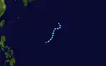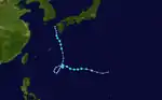 The initial system that led to Typhoon Doris began between Pohnpei and Chuuk State on July 9.[6] Tracking towards the west-northwest, it passed near Chuuk and became a tropical depression on July 11 while 480 km (300 mi) south of Guam.[72][6][12]: 75 Doris became a tropical storm by 12:00 UTC that day as it began to track northwest across the Philippine Sea. Early on July 13, Doris strengthened into a typhoon while approximately 800 km (500 mi) east of Luzon.[72][12]: 75 The next day, Doris attained one-minute sustained winds of 150 km/h (93 mph). It weakened as it curved north towards the southern Ryukyu Islands, becoming a tropical storm on July 14 and then a tropical depression on July 15 while passing near Tarama, Okinawa. The system continued to decay as it moved north and dissipated over the Yellow Sea on July 17.[72]