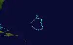 TIROS imagery indicated a very weak circulation near 12°N, 40°W on October 11. Ship reports on the following day indicated a somewhat more organized circulation.[7] As a result, it is estimated that the final tropical depression of the season at 1200 UTC on October 12, while located about midway between Cape Verde and the Leeward Islands. Initially, the depression remained disorganized while tracking northwestward. However, by early on October 14, the depression strengthened into Tropical Storm Elena. The storm continued to intensify as it headed northwestward, before turning to the northeast late on October 16. Elena became a Category 1 hurricane at 1200 UTC on October 17 and then reached Category 2 status early the next day. Around 1200 UTC, Elena attained its peak intensity with maximum sustained winds of 110 mph (175 km/h) and a minimum barometric pressure of 977 mbar (28.9 inHg). At 0600 UTC on October 19,[8] the storm merged with an approaching cold front near the Azores.[7] The remnants moved rapidly north-northeastward until dissipating near Iceland on October 20.[8]